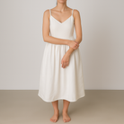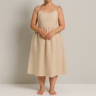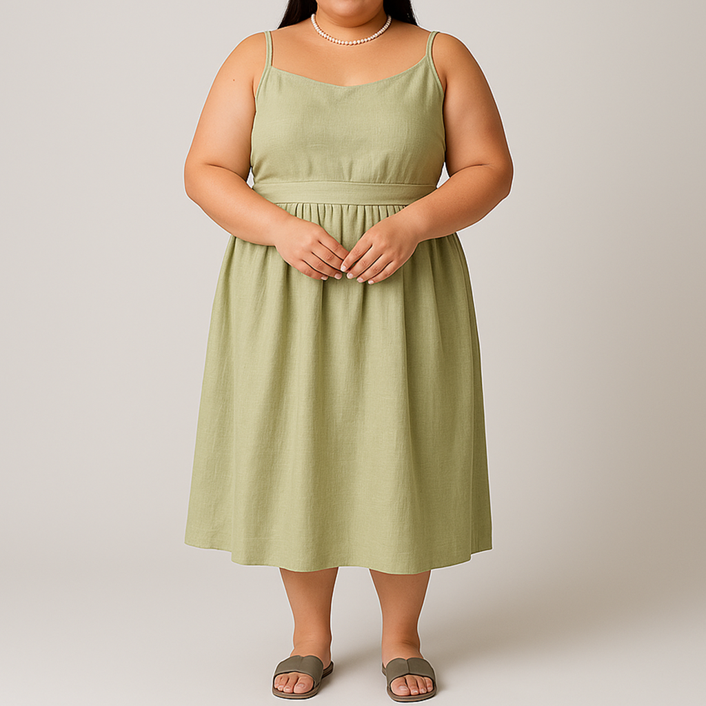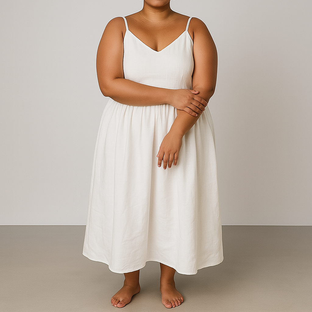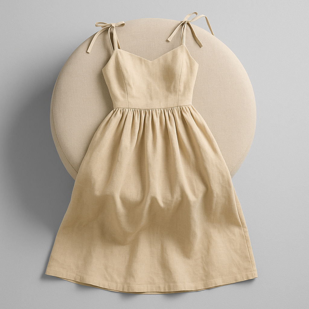 Das Kleid bietet eine luftige Passform mit offenem Rücken und flexiblen Trägern. Es kombiniert klare Linien mit Funktionalität und ist ideal für den Alltag sowie Urlaubsanlässe.