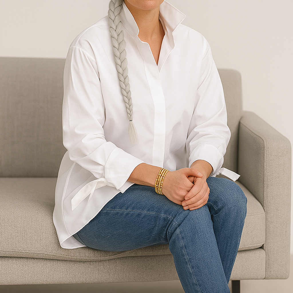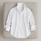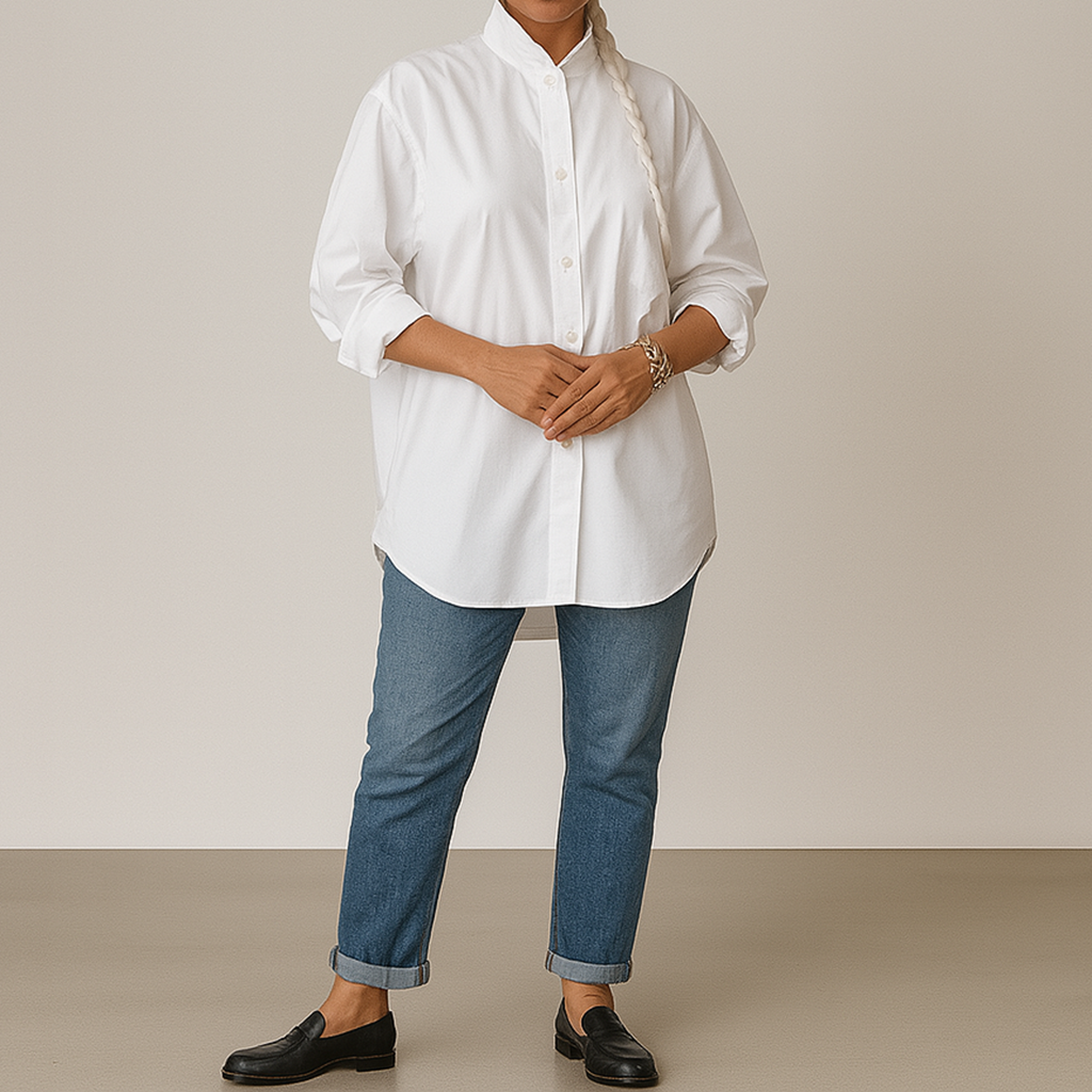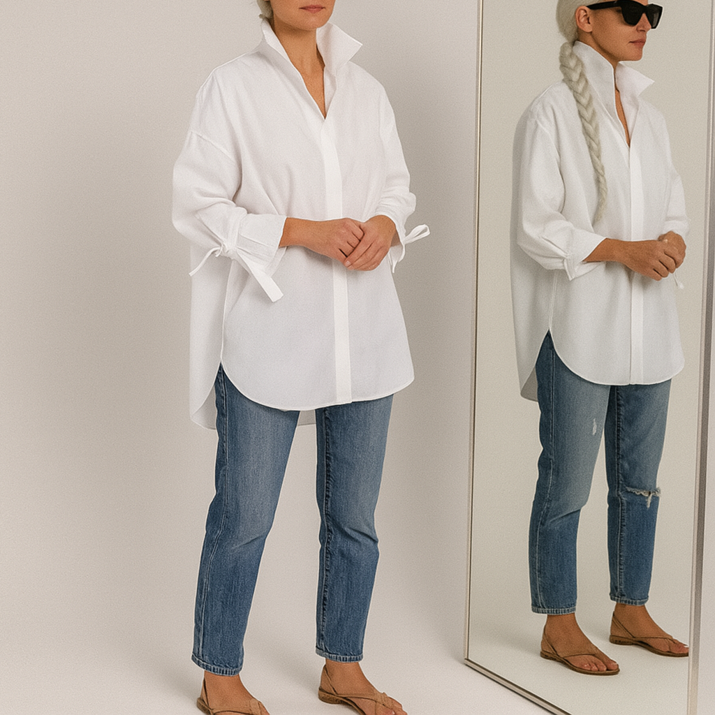 Die Langarmbluse im Oversize-Stil bietet Komfort und klare Linien für den Alltag. Der verlängerte Schnitt mit auffälligem Kragen sorgt für Präsenz ohne Aufwand.