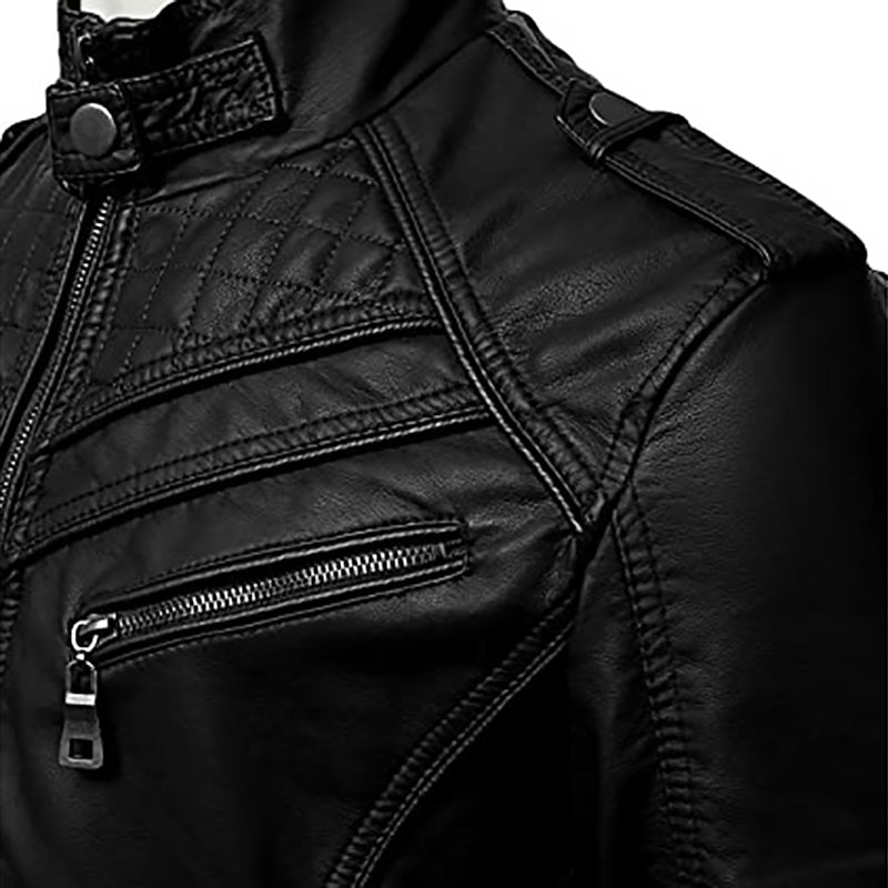 Diese Herren Bikerjacke kombiniert einen geraden Schnitt mit funktionalen Details. Mehrere Reißverschlusstaschen und ein Stehkragen unterstützen einen praktischen Einsatz auf der Straße, im Alltag oder auf Kurztrips.