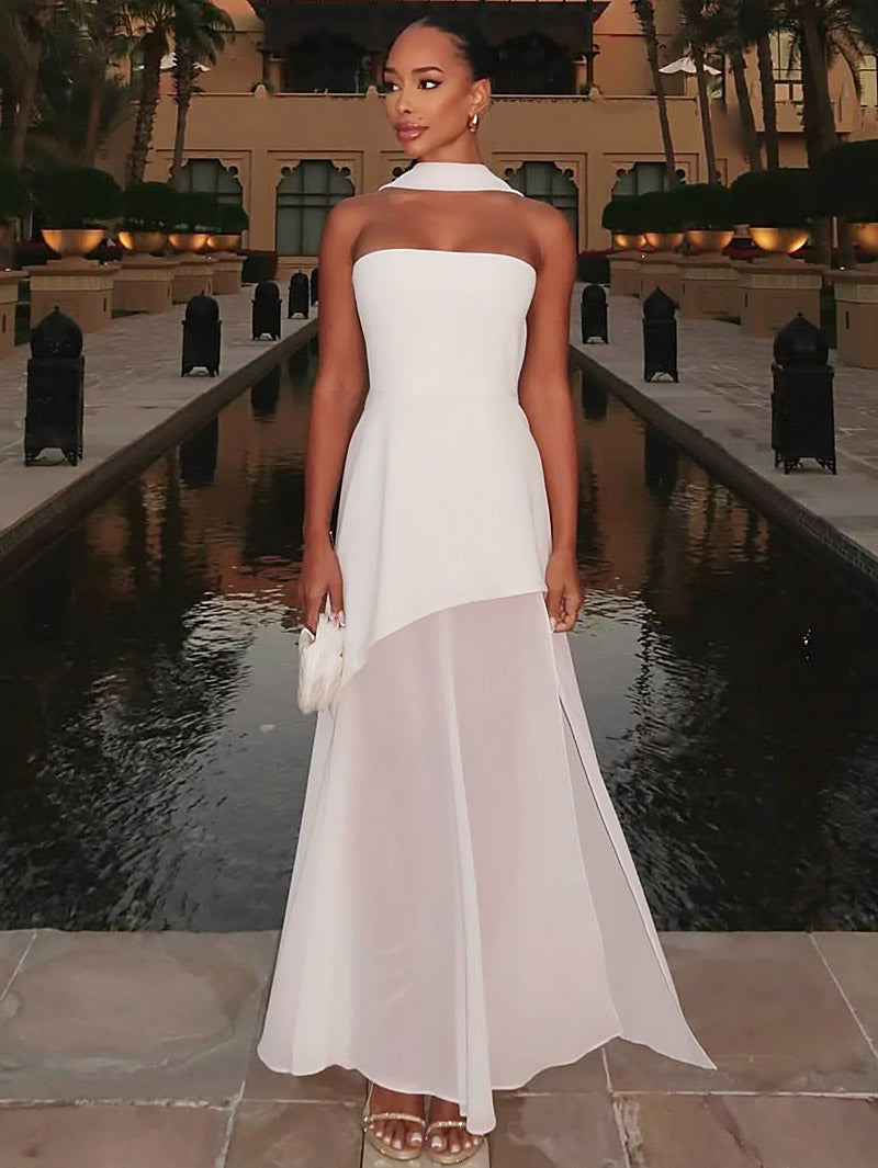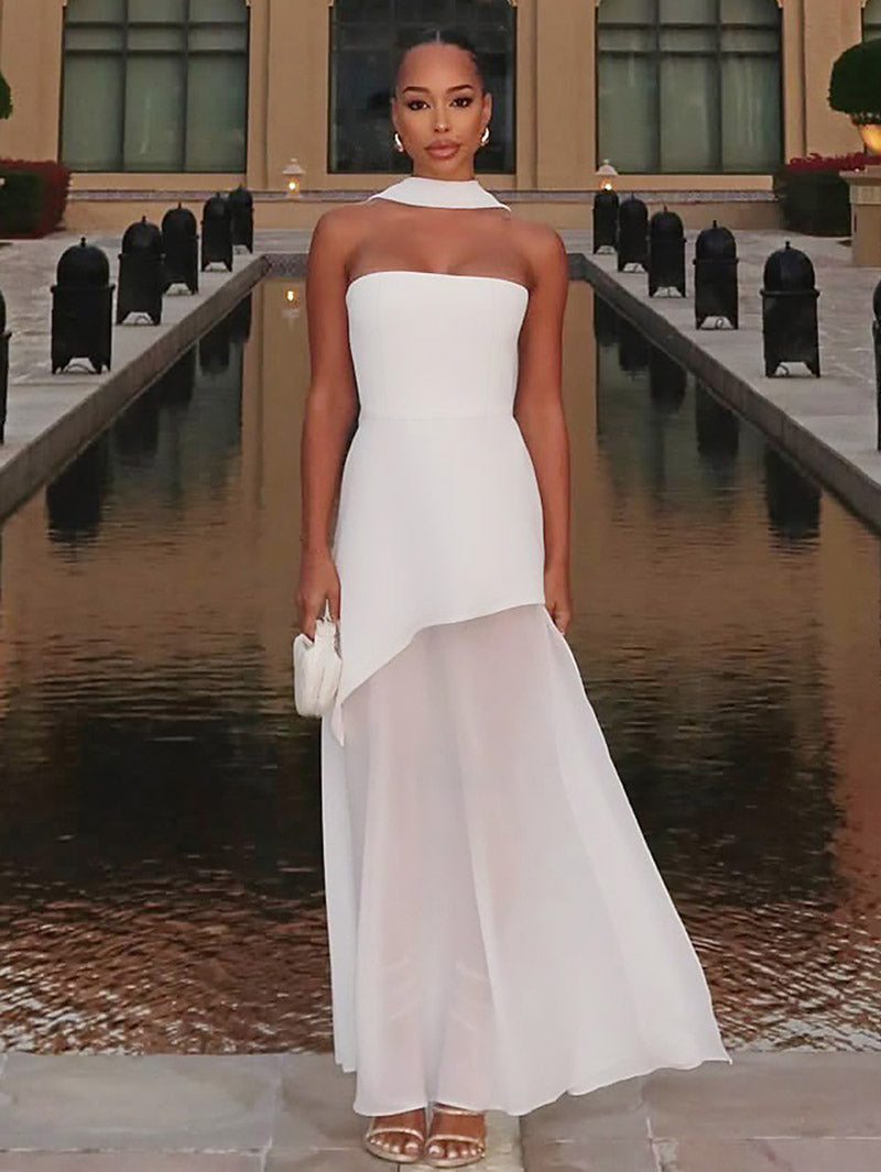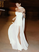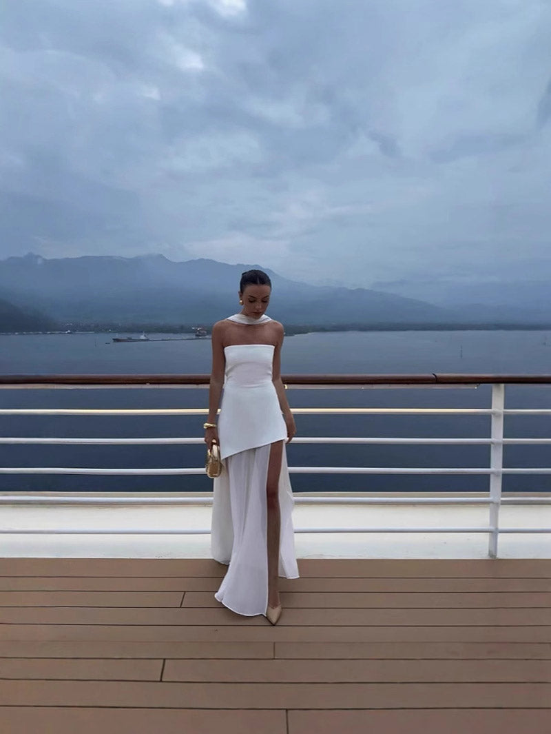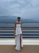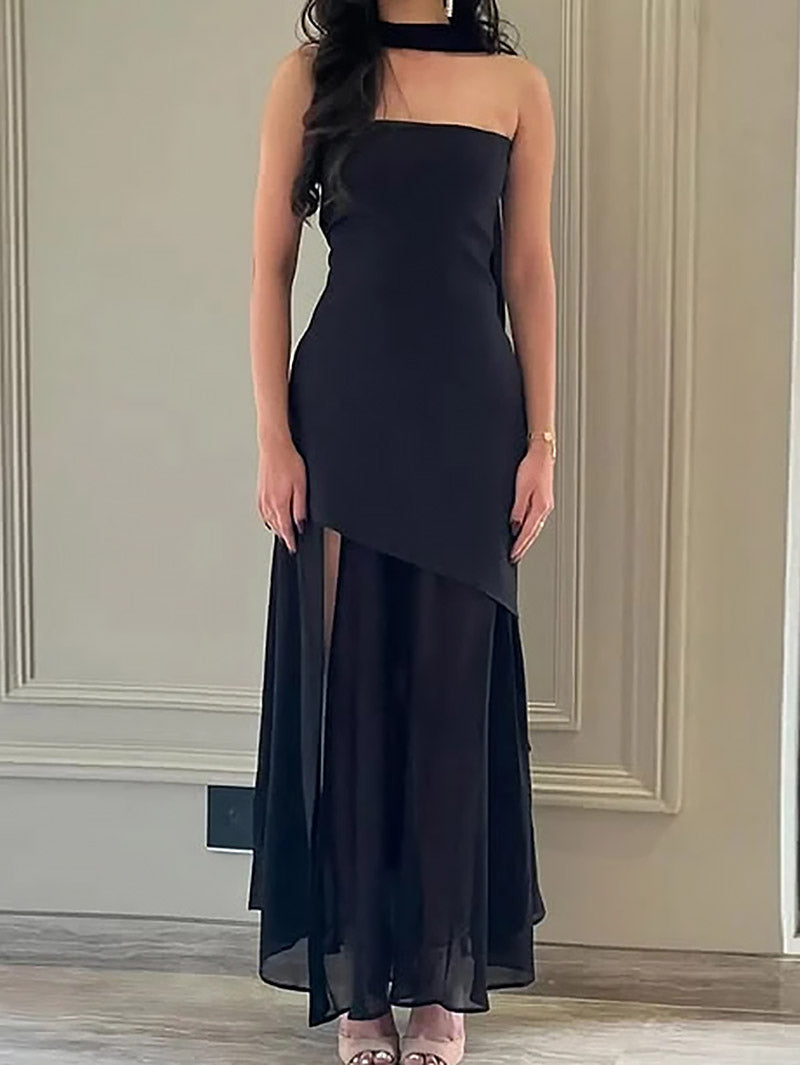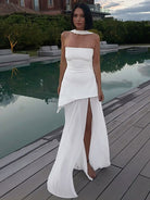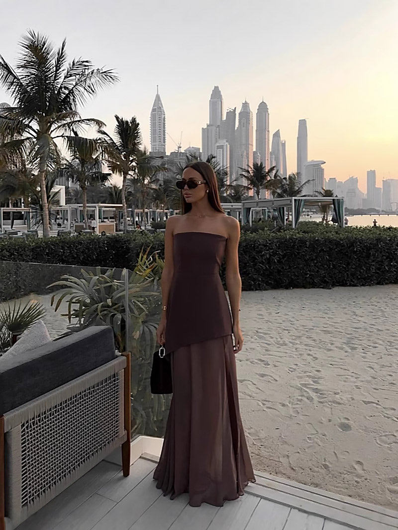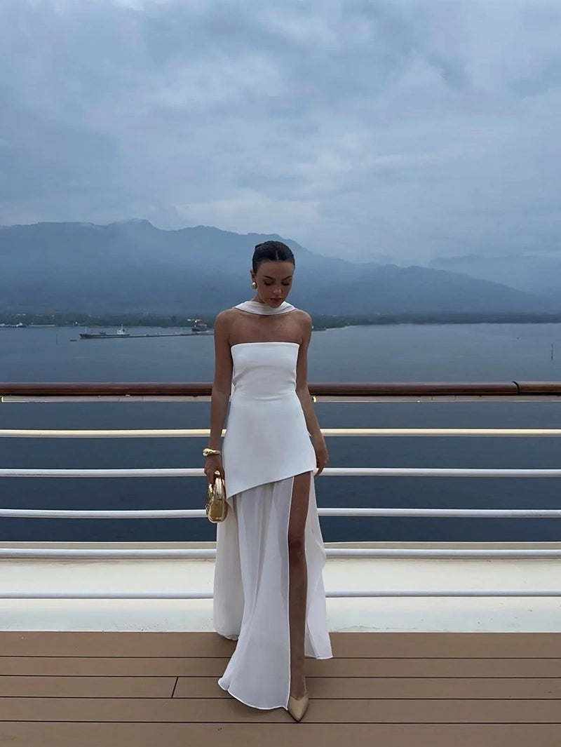 Dieses Damen Kleid in trägerloser Form mit asymmetrischem High-Low-Saum kombiniert eine klare Silhouette mit stilvoller Bewegung. Der lange Schnitt mit seitlichem Schlitz macht es zur passenden Wahl für Hochzeitsgäste, Abendveranstaltungen oder festliche Feiern.