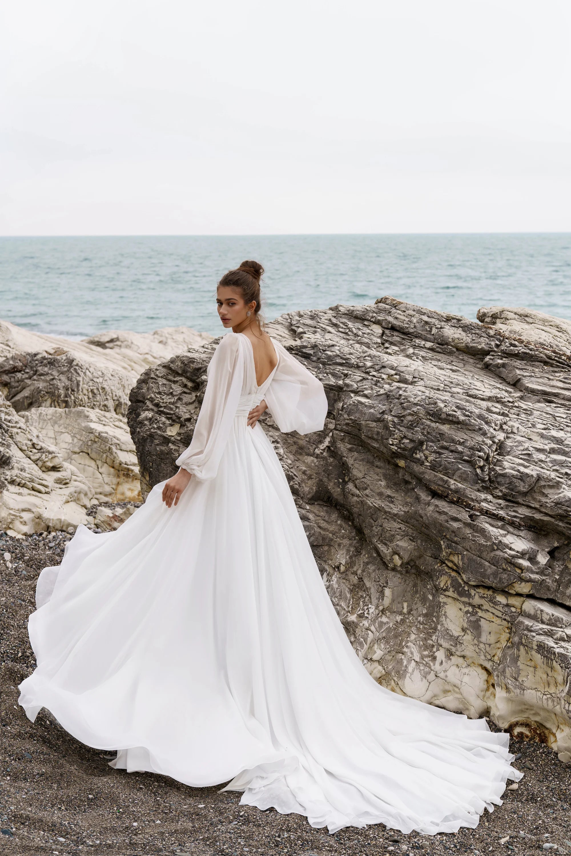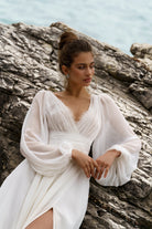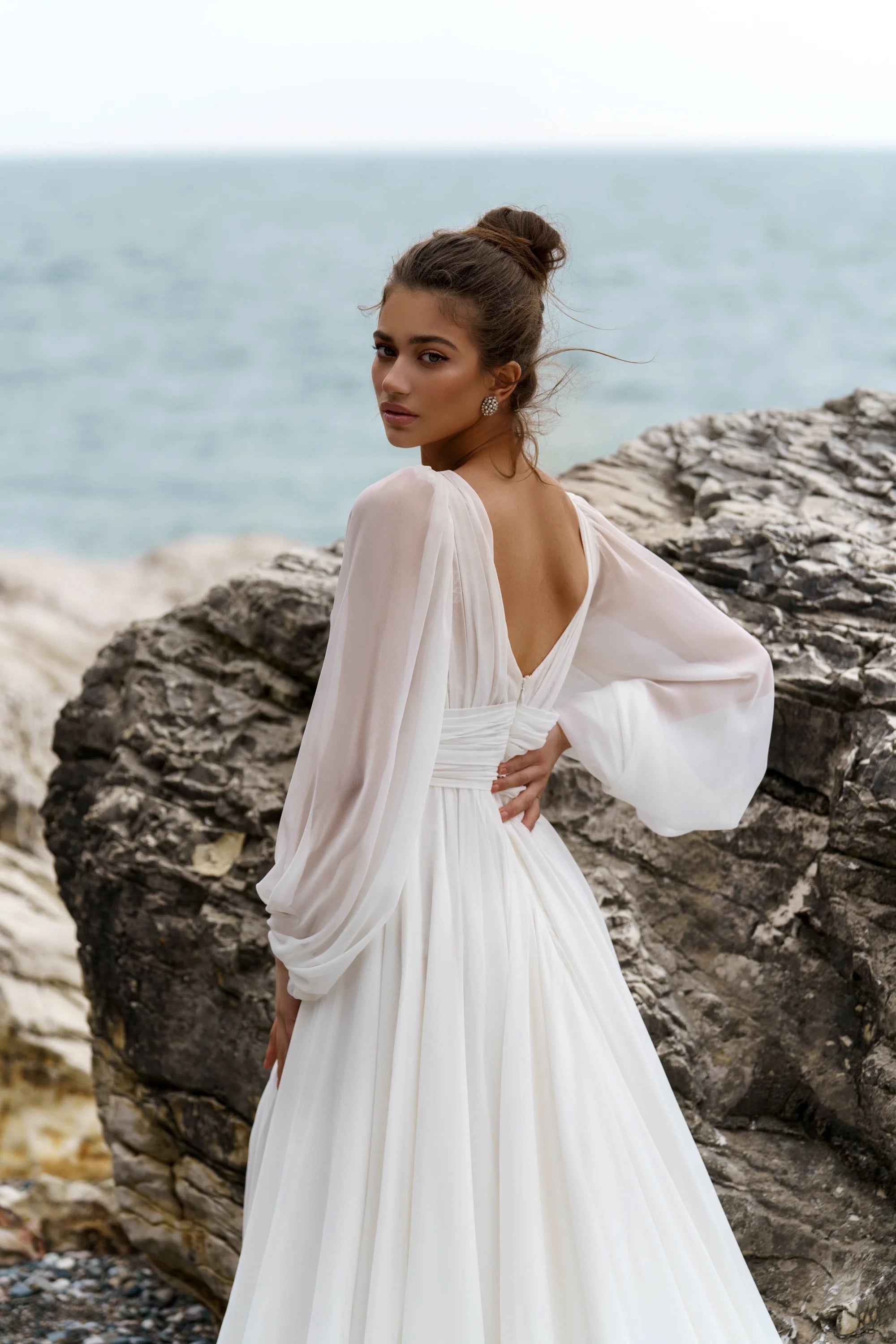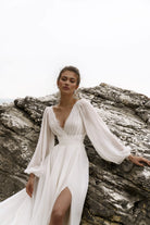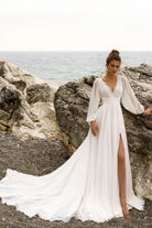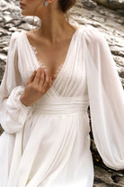 Dieses Damen Hochzeitskleid in Maxi-Länge mit langen Ärmeln und seitlichem Schlitz kombiniert eine klare Silhouette mit moderner Ausstrahlung. Das Kleid eignet sich ideal für Strandhochzeiten, Gartenhochzeiten oder das Standesamt.